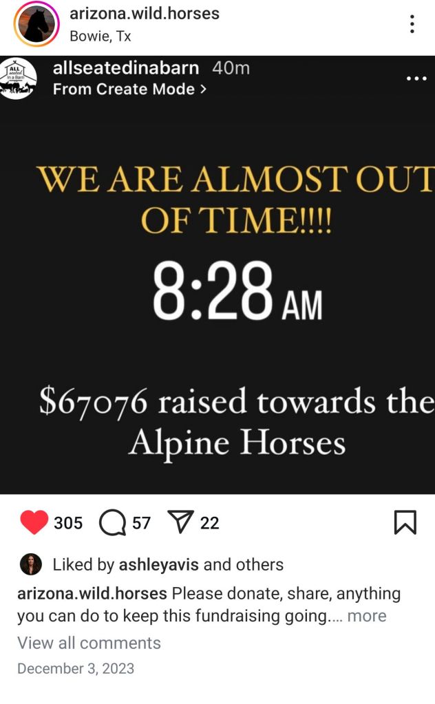 This is a lot of information to take in at once! I’m not sure I will ever gain enough clarity to post a full rundown of events. In the meantime, please support the Alpine wild horses if you can! Rescues need ongoing support for essentials like hay, vet bills, farrier, etc.